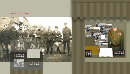 The atmosphere of a WWI front-line airfield forms the backdrop to this museum display for a unique private collection of Royal Flying Corp memorabilia. Cases are finished using corrugated sheet and graphic panels supported on replica biplane struts.